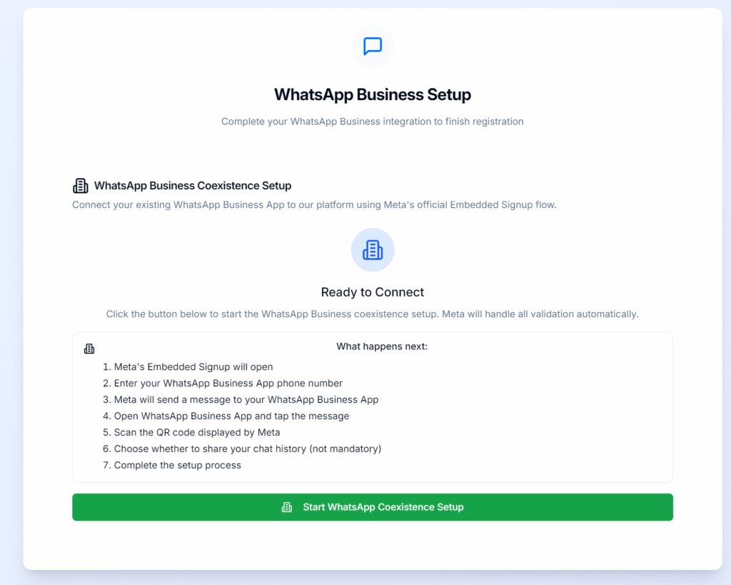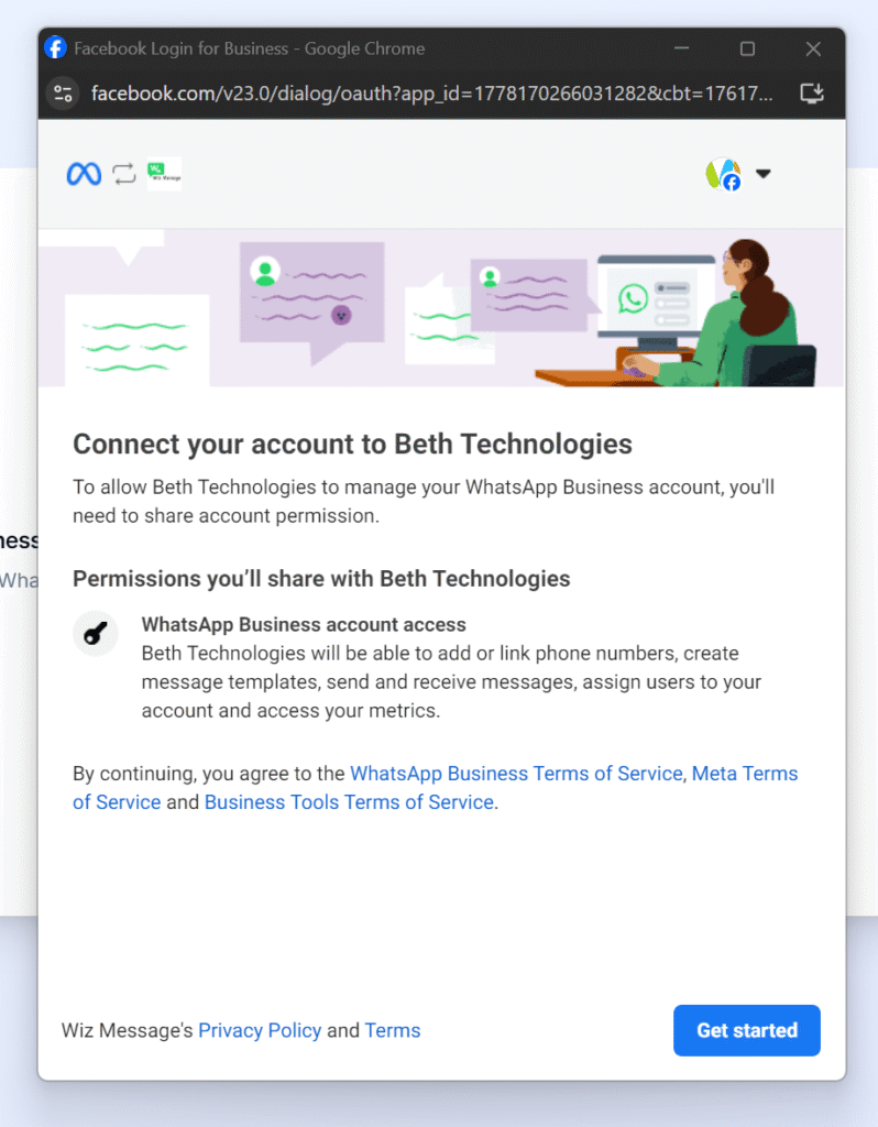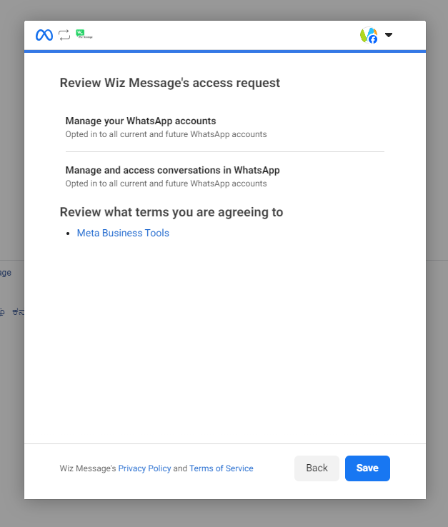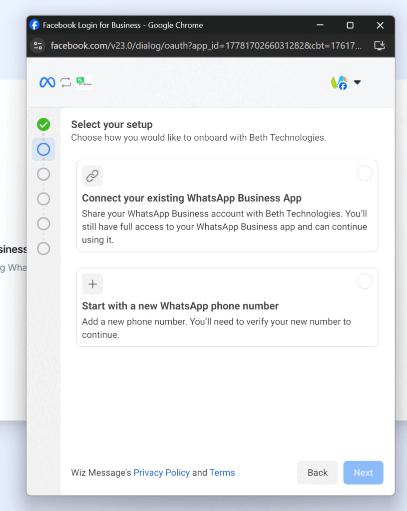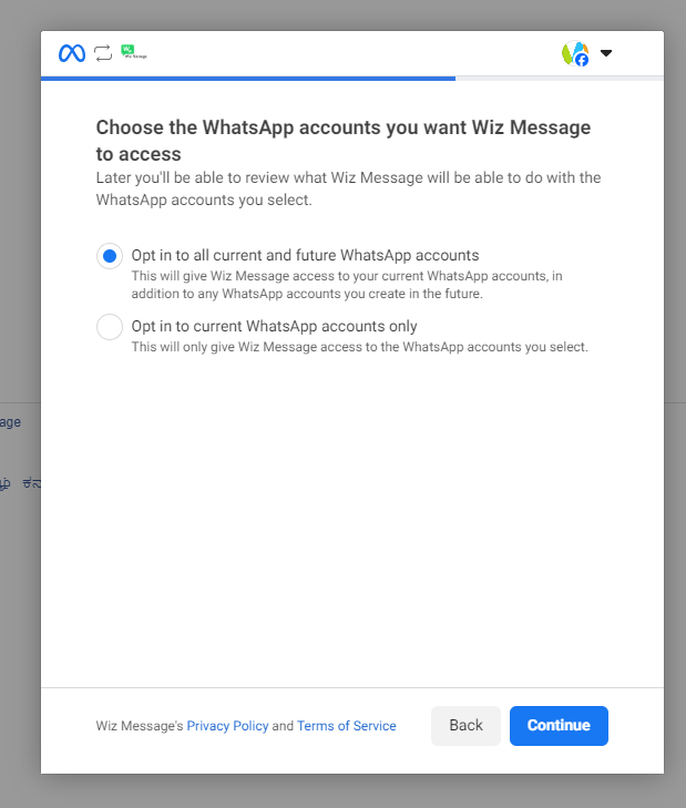 2. Click on Connect Facbook Business button in register link https://wizmessage.com/register3.You will get the prompt from facebook that wiz message will receive your name and profile picture. Click Continue as {your facebook name}4.You are asked to choose the WhatsApp accounts you want Wiz Message to access, Opt in to all current and future WhatsApp accounts, otherwise you cannot connect your WhatsApp number. Click Continue5. Review screen- just click save6. You will get the info –{Your Facebook} has been connected to Wiz Message, click on Got it7.Enter your email id , password , country , currency , timezone , after entering click on Continue to co-existence setup8. Now you will get another confirmation screen, click on Start WhatsApp Co-existence Setup9. Click on Continue as {Your Facebook}10. click on Get Started11. Fill out your business info: business portfolio, name, website and country., click Next12.Select the option to connect your existing WhatsApp Business number.13.After you enter your WhatsApp number, you’ll see a QR code on your screen.14.Check your WhatsApp for a message from Facebook Business and tap on Scan QR code.15.Confirm your choice by tapping Scan QR code.16.There is no need to share the chat history, since you can access your chats in your old app or WhatsApp web. after this screen click on done