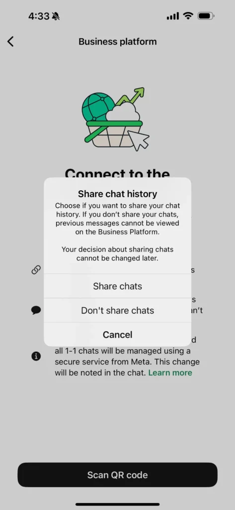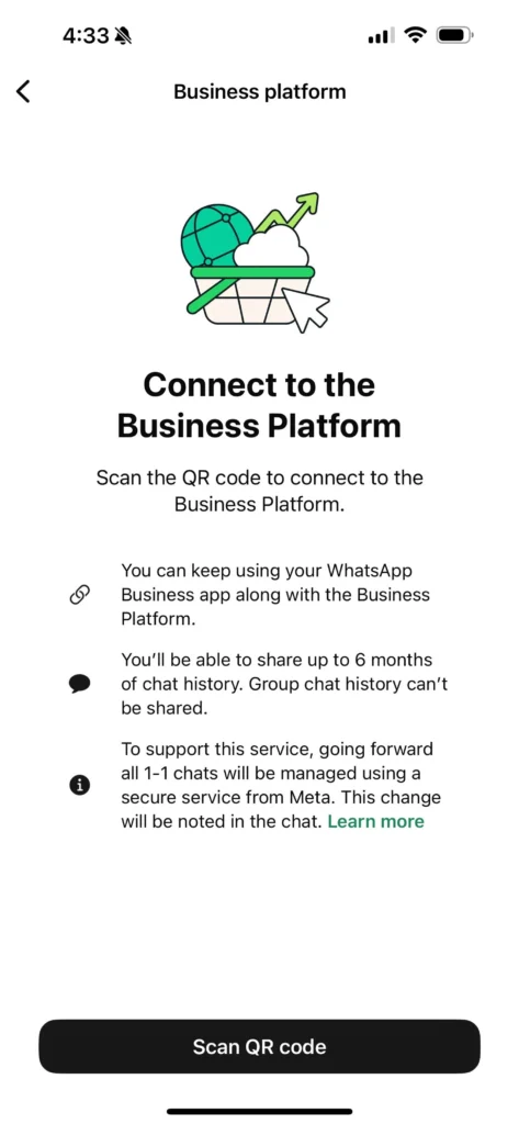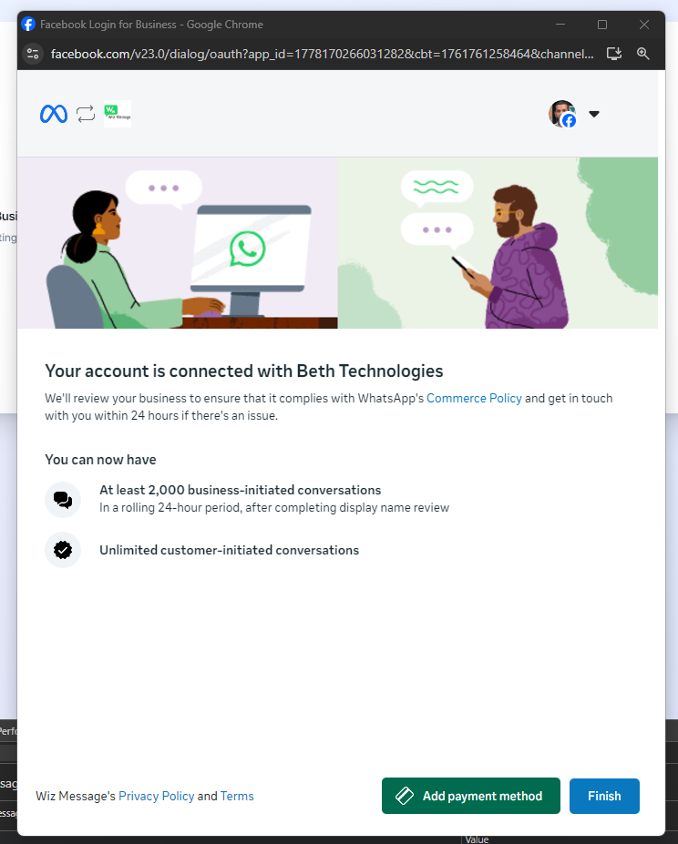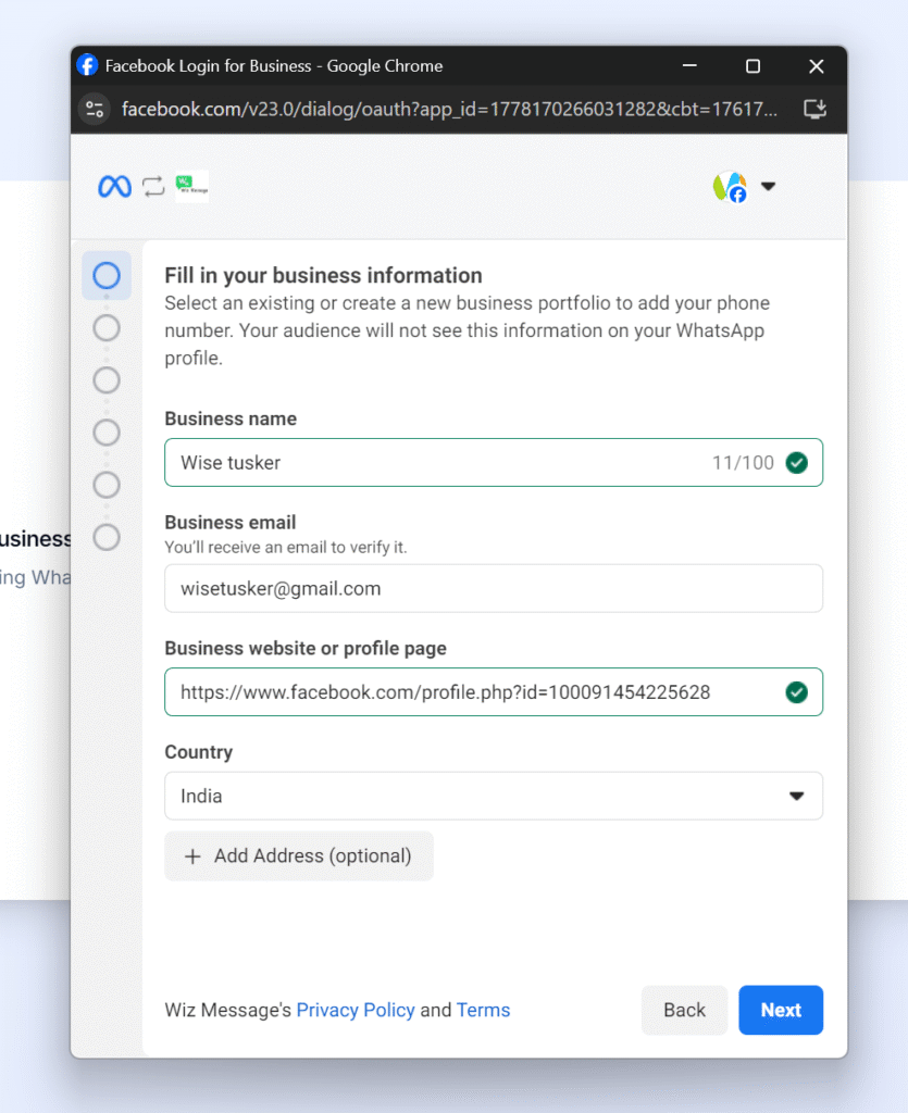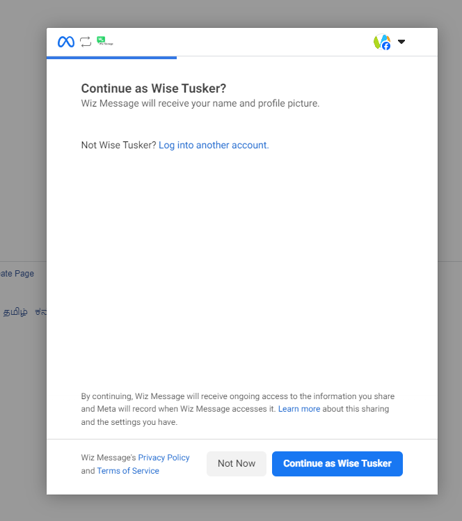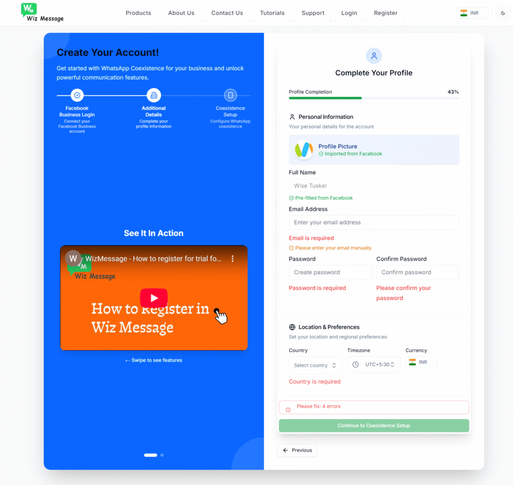 2. Click on Connect Facbook Business button in register link https://wizmessage.com/register3.You will get the prompt from facebook that wiz message will receive your name and profile picture. Click Continue as {your facebook name}4.You are asked to choose the WhatsApp accounts you want Wiz Message to access, Opt in to all current and future WhatsApp accounts, otherwise you cannot connect your WhatsApp number. Click Continue5. Review screen- just click save6. You will get the info –{Your Facebook} has been connected to Wiz Message, click on Got it7.Enter your email id , password , country , currency , timezone , after entering click on Continue to co-existence setup8. Now you will get another confirmation screen, click on Start WhatsApp Co-existence Setup9. Click on Continue as {Your Facebook}10. click on Get Started11. Fill out your business info: business portfolio, name, website and country., click Next12.Select the option to connect your existing WhatsApp Business number.13.After you enter your WhatsApp number, you’ll see a QR code on your screen.14.Check your WhatsApp for a message from Facebook Business and tap on Scan QR code.15.Confirm your choice by tapping Scan QR code.16.There is no need to share the chat history, since you can access your chats in your old app or WhatsApp web. after this screen click on done