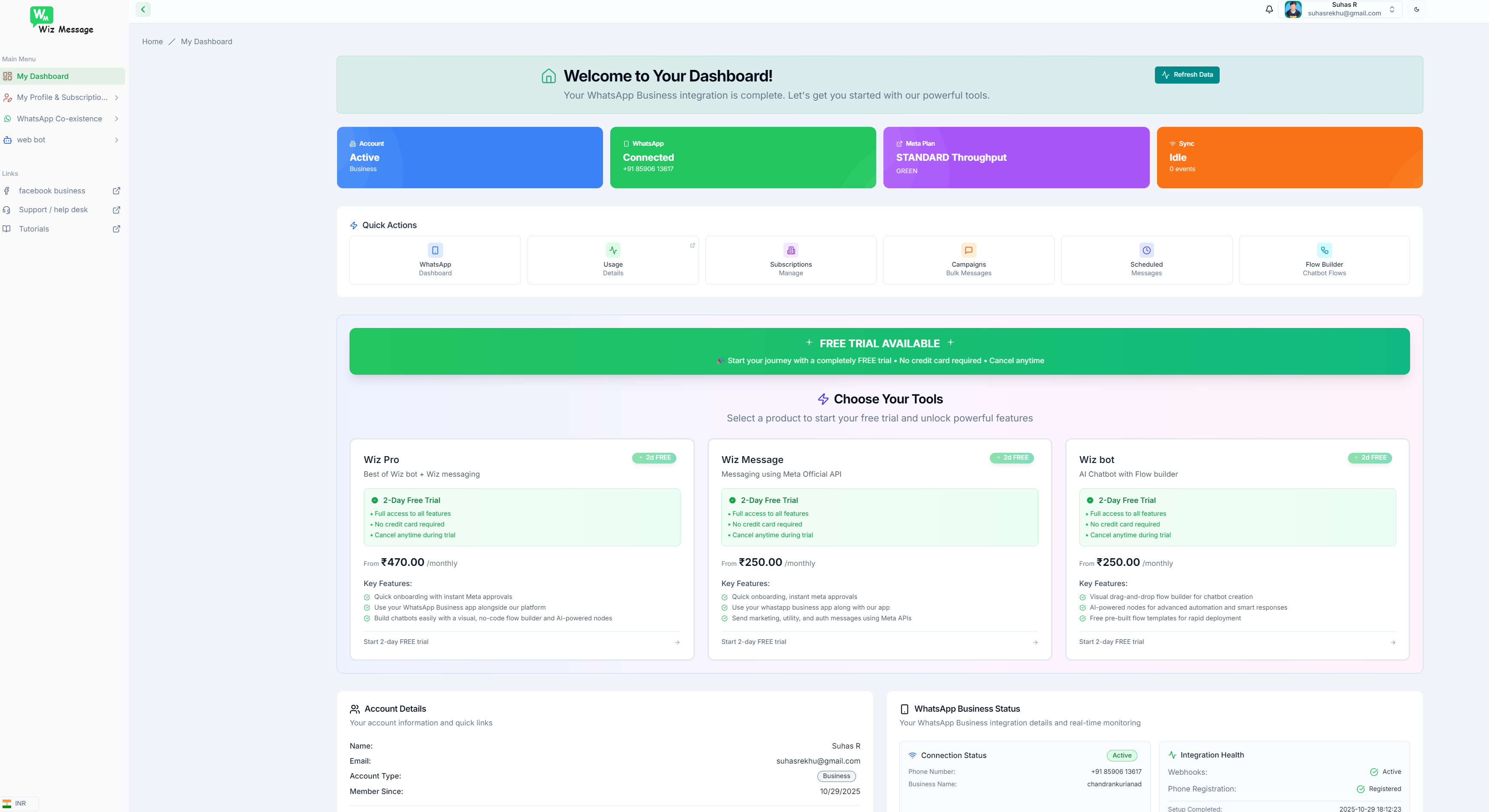 WhatsApp number will continue to work as before. And will also be connected to Wiz Message where you can access all the features for sending Bulk Messages , the AI tools and other features.