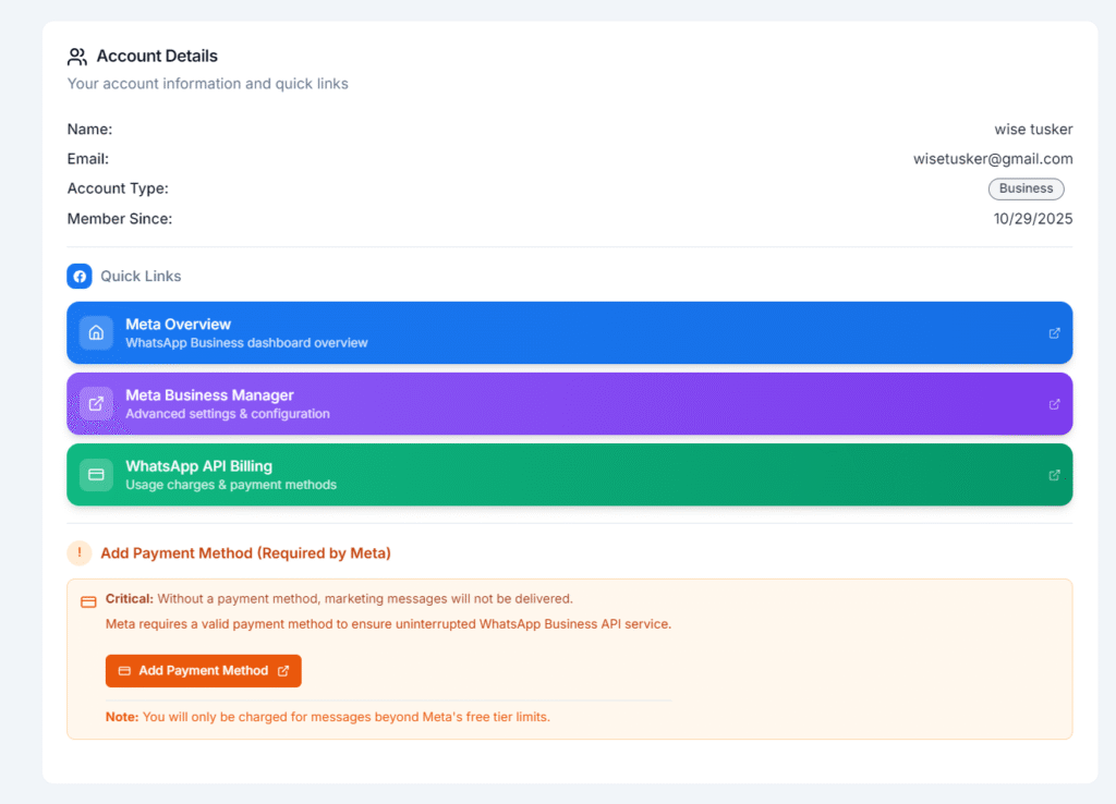 19.If you didn’t add the payment details to your facebook , you can later click it from your dashboard. For some countries, you need to add the GST/VAT details as per the facebook , otherwise bulk messages/promotional messages will fail